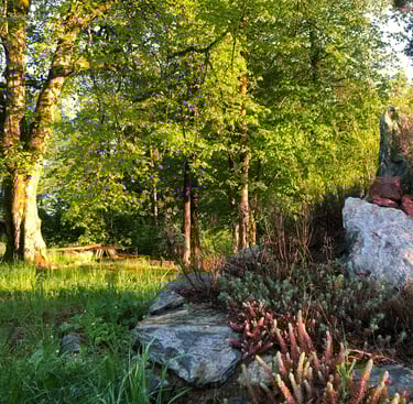 The 7 hectare site is designed with great care and grows into a large edible garden; many variations of local fruit trees, berries and bushes can be found here. Regenerative agriculture is practiced and animals find their welcome place in the cycle.