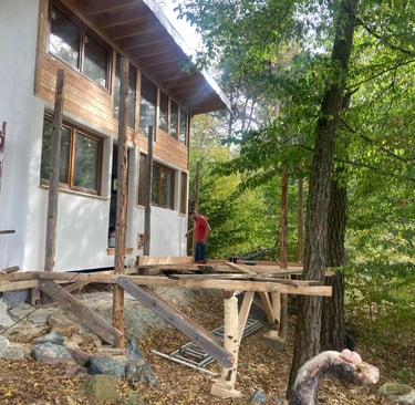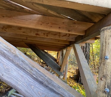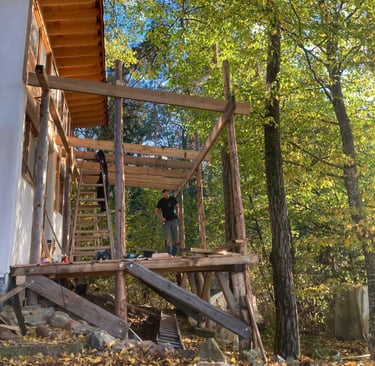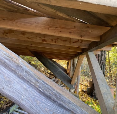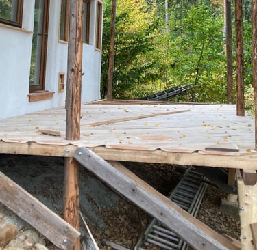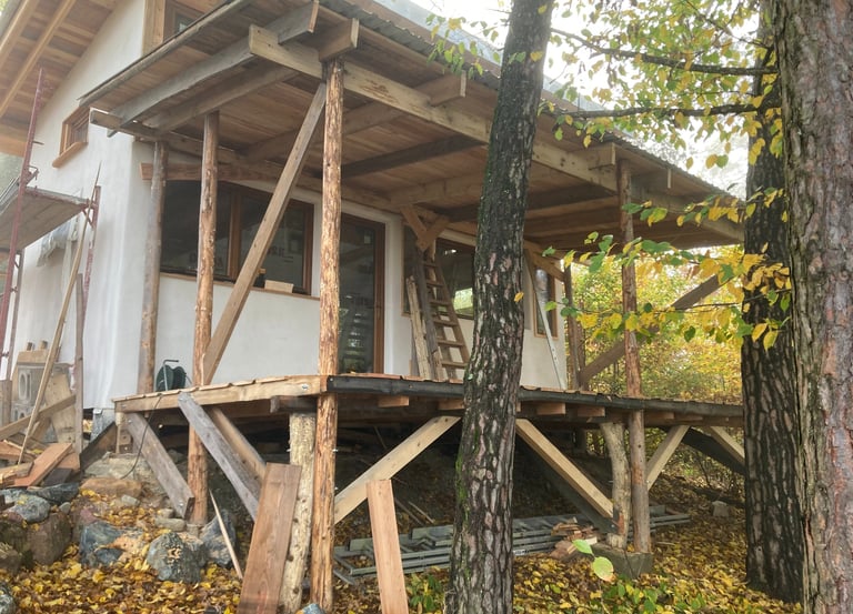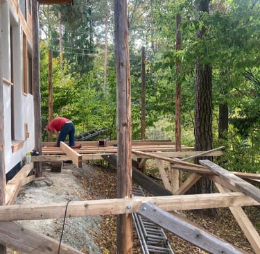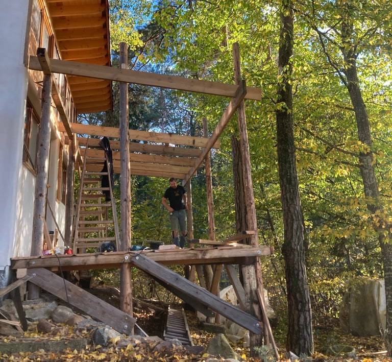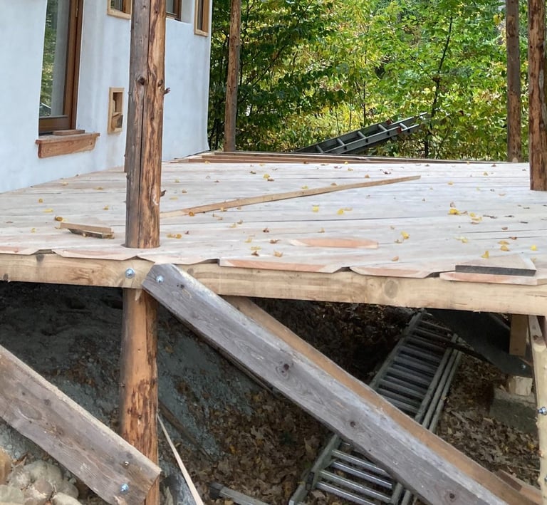 Die Unterkonstruktion wird dem Gelände angepasst. Diese soll stabil sein, da sie das Gewicht des Daches und der Terasse tragen muss. Die Stützkonstruktion steht auf Beton/Stein, damit das Holz nicht so schnell morscht. Das gerade Ausrichten der Unterkontruktion ist enorm wichtig, hier wird mit Sand und Waschbetonplatten ausgeglichen, bis alles passt. Ebenso schauen wir, dass die Stabilität gegeben ist und steifen mit vielen Querverstrebungen aus.