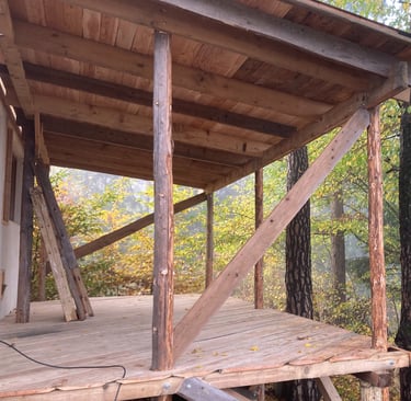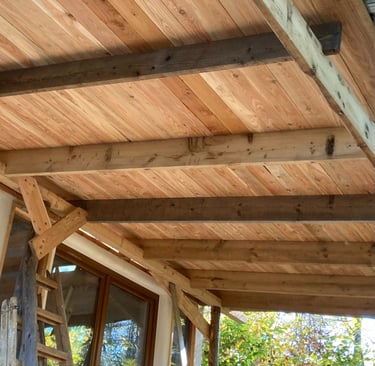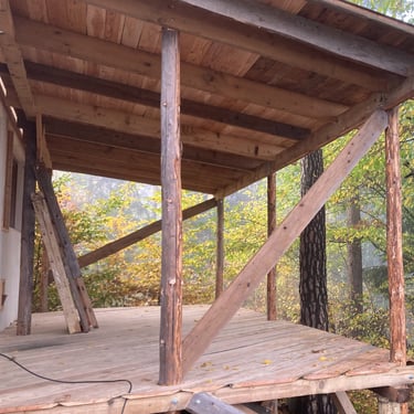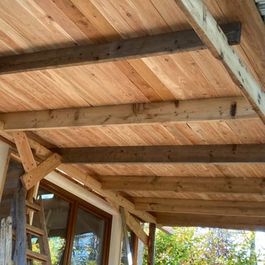 Wir haben Bäume aus dem angrenzenden Wald genommen, diese wurden im Sägewerk eines Nachbarn verarbeitet und zu Pfosten und Brettern mit Naturkante gesägt. Die Schalung für das Dach bekamen wir vom Holzhändler in der Nähe, dieser hat immer Sonderposten mit 2m Länge, was dem Geldbeutel zu Gute kommt. Da die Terasse ja dem Wetter ausgesetzt ist, haben wir lieber Lärche als Fichte genommen ; )