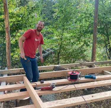 Wenn die Unterkonstruktion für Boden und Dach stehen, machen wir uns an das Verlegen der Bretter für den Boden.